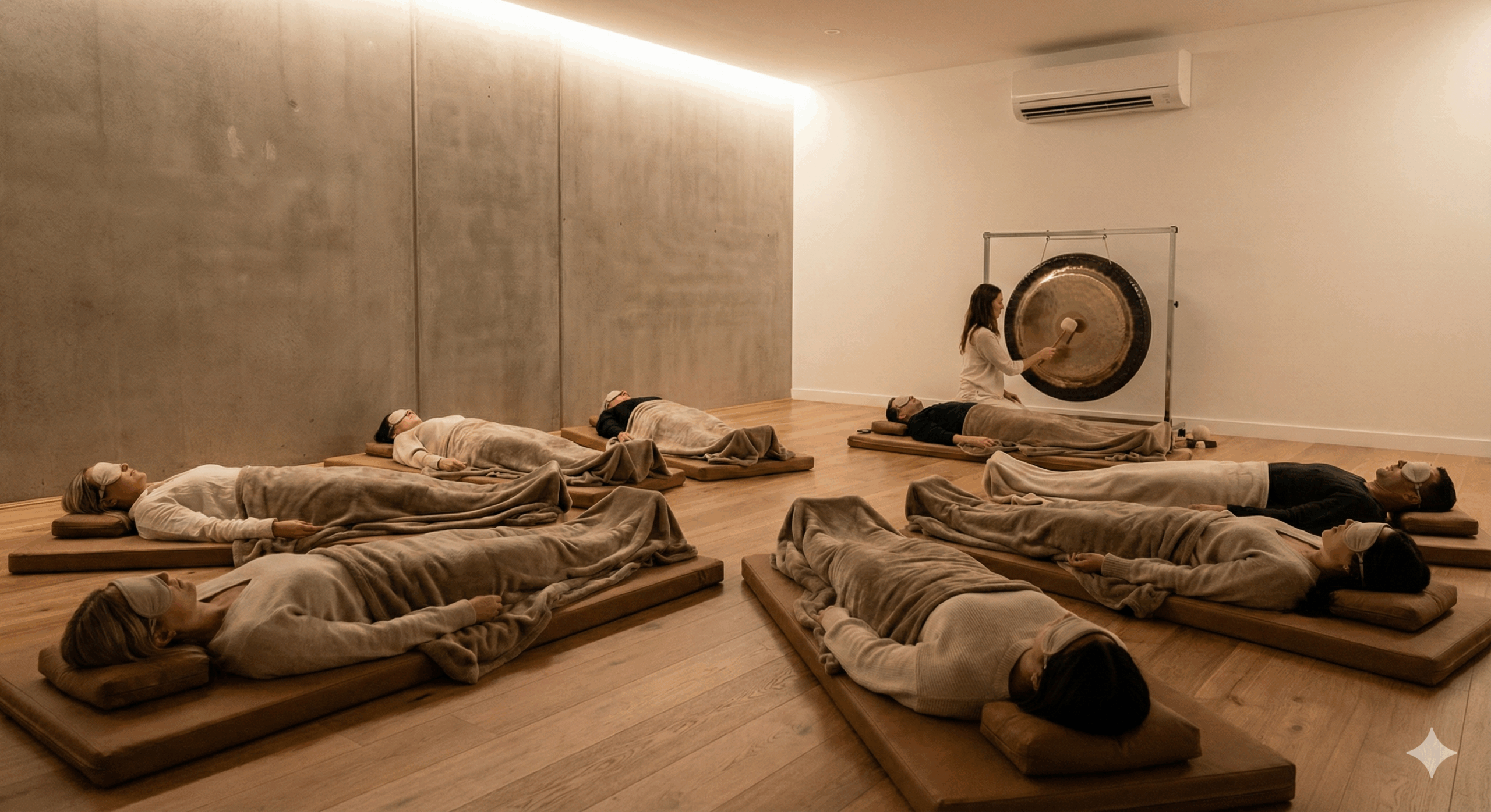 - Te recuestas cómodamente mientras el facilitador crea un paisaje sonoro envolvente con Gongs y cuencos.